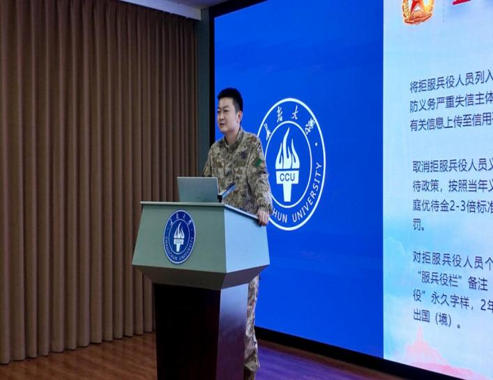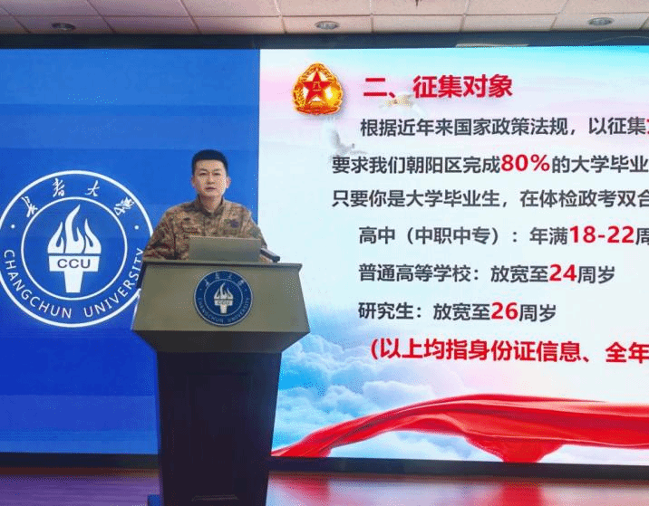 12 月 17 日下午,长春市朝阳区人民武装部征兵宣讲团走进长春大学,在知行楼 B 区 703 会议室开展专场征兵宣传活动。活动以政策解读为核心、以互动交流为纽带,有效激发了广大青年学子携笔从戎、报效祖国的青春热忱。