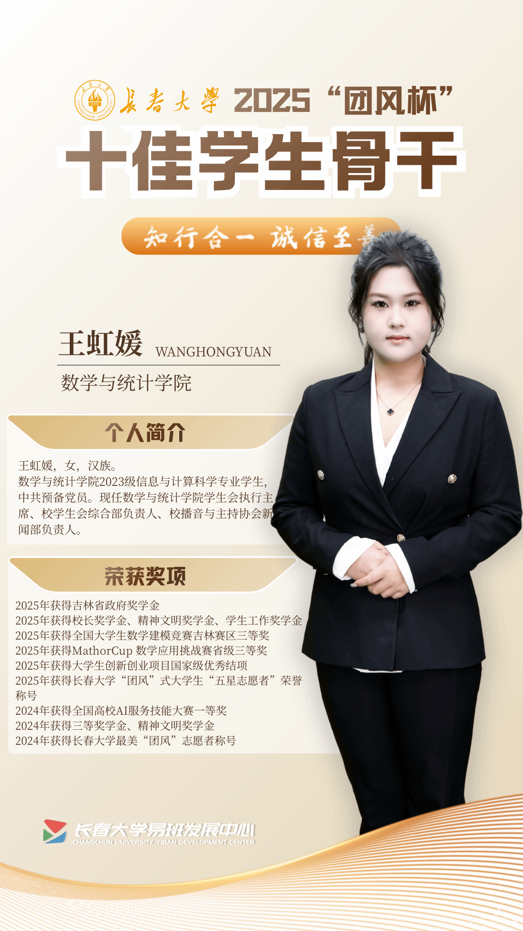从“优秀班委”到“学生会执行主席”,从“年级优秀学生”到“优秀学生标兵”,从学科竞赛的领奖台到志愿服务的第一线,王虹媛以勤勉为舟、以责任为帆,在青春的赛道上奋力奔跑,用勤勉与责任书写着无悔青春。20余项荣誉见证了她的成长,也正是她全面发展、勇于担当的最好见证。未来,她将继续以初心践行使命,以实干书写担当,用实际行动践行“知行合一,诚信之善”的校训,在更广阔的舞台上绽放青春光彩,为国家与社会贡献青年力量。