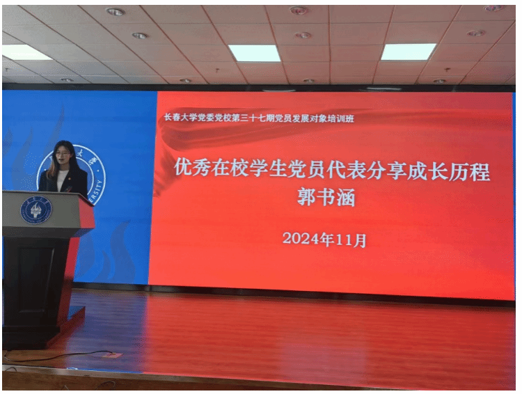郭书涵在思想方面积极上进,认真学习党的理论知识,时刻与党中央保持一致,坚持用习近平新时代中国特色社会主义思想指导行动,在党组织的培养下深入学习党章、党史、党纪,不断提高个人思想觉悟,2024年6月,按期转正成为一名中共正式党员。2024年11月,在长春大学党校第37期发展对象的培训中,郭书涵作为学生党员代表发言,向参加培训的发展对象分享党员成长经历,帮助培训学员坚定理想信念,明确前进方向,向着一名合格中共党员努力。
