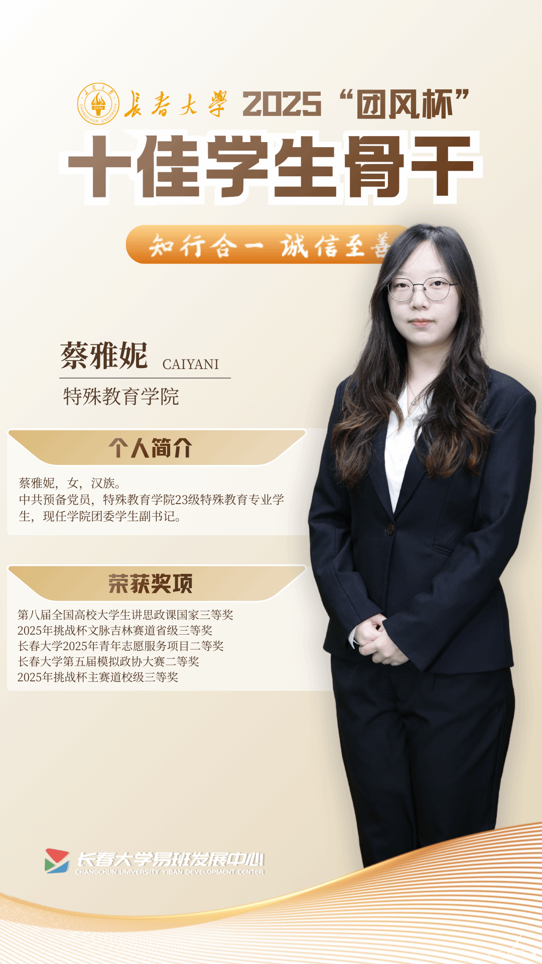 蔡雅妮,女,汉族,中共预备党员,特殊教育学院23级特殊教育专业学生。现任学院团委学生副书记。