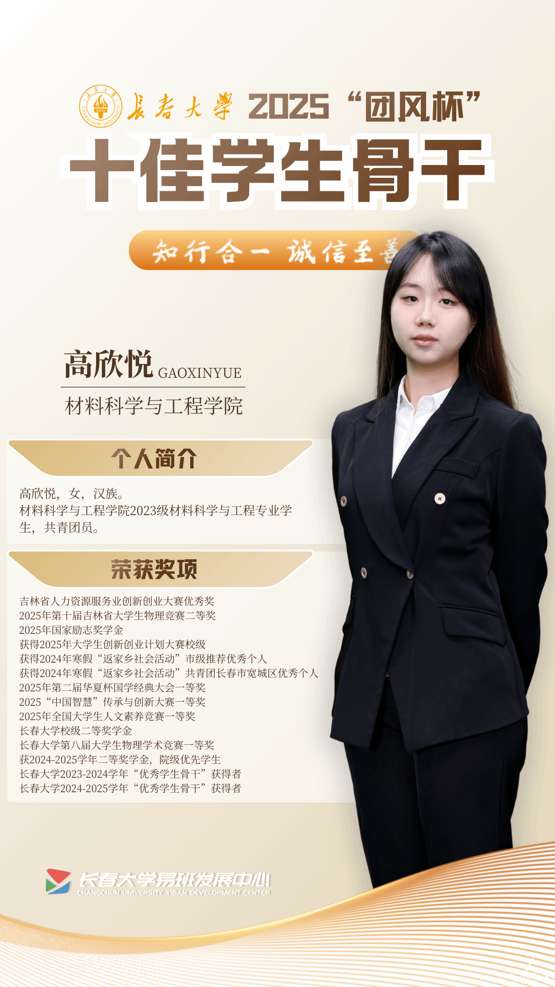 心似锦簇,自然芬芳。高欣悦始终以“勤学、修德、明辨、笃实”为准则,在思想上坚定信念,在学业上追求卓越,在工作中履职尽责,在实践中勇担使命。未来,她将继续秉持事必躬亲的态度、勇攀高峰的精神,争做有理想、敢担当、能吃苦、肯奋斗的新时代好青年,为学校发展和社会进步贡献青春力量。